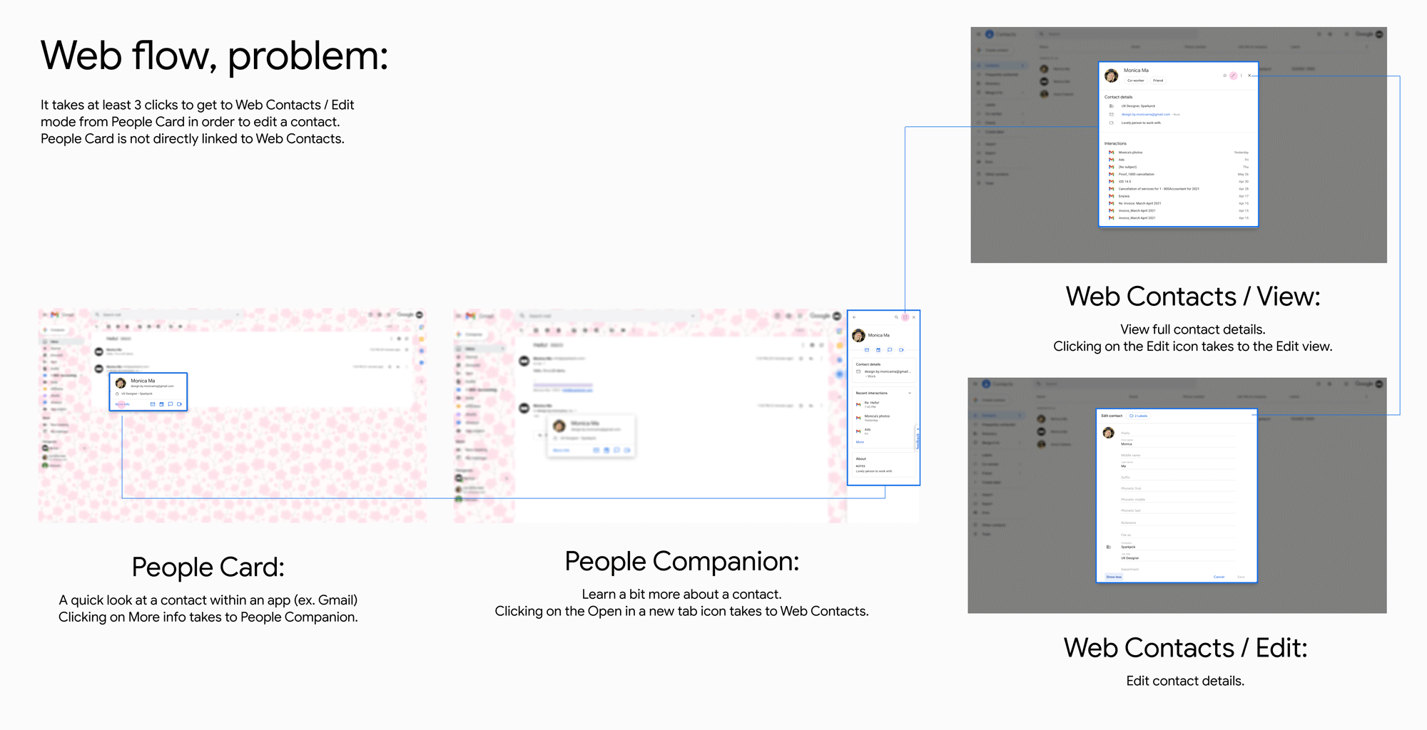 Original user journey on the Web in People & Sharing: customers couldn’t directly edit a contact in People Card and had to navigate to People Companion to get access to Web Contacts. This journey took at least 3 clicks.