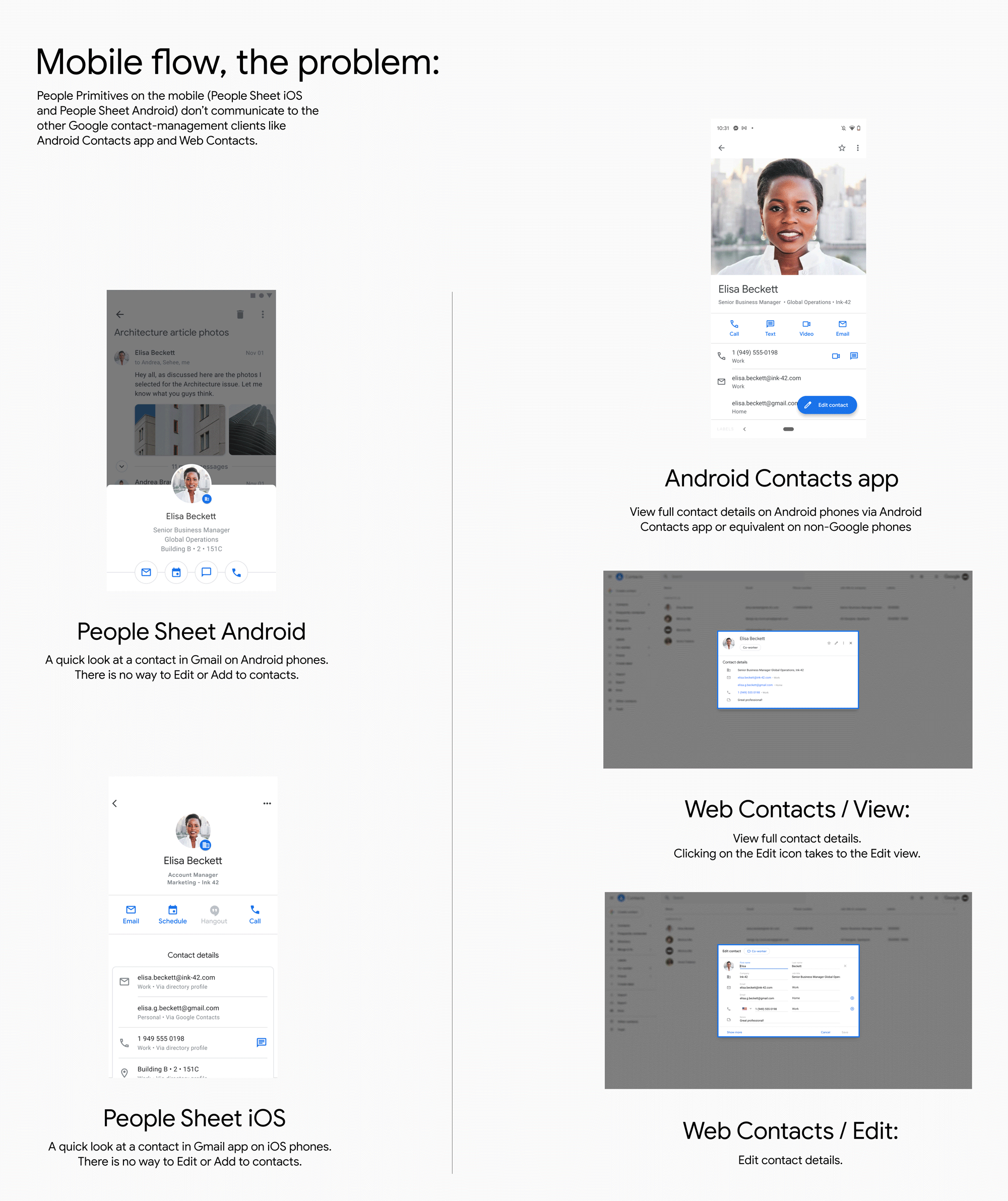 Original user journey on the mobile in People & Sharing: customers couldn’t directly edit and add a contact in People Sheet Android and People Sheet iOS.