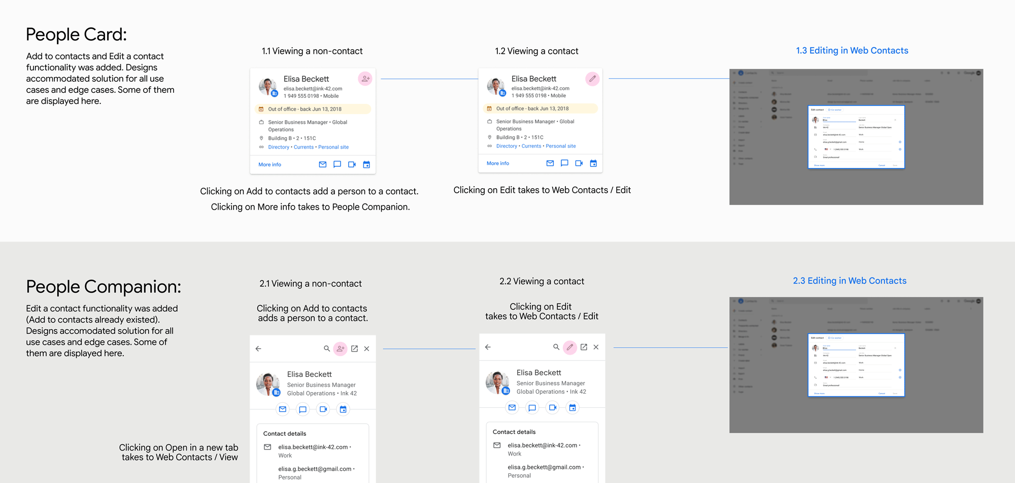 One of the problems we solved for the People & Sharing surfaces was cross-linking and cross-alignment. We’ve been getting consistent user complaints in user research sessions and submitted user feedback that people want to be able to edit an existing contact and add a person to contacts. This feedback was consistent across People Card, People Companion, and People Sheet. The existing UIs for the mobile and Web didn’t accommodate for these user needs, which resulted in broken user journeys and unhelpful poor overall user experience.